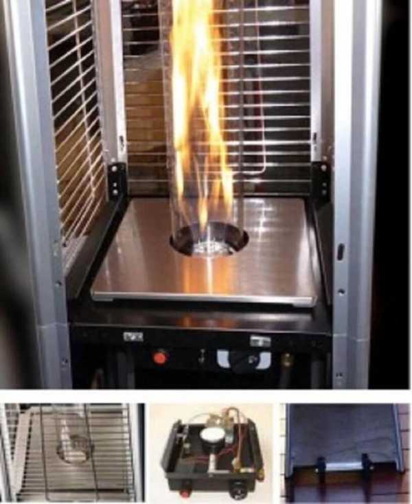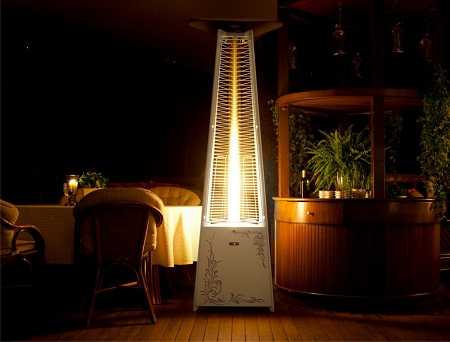 Следующий тип — это уличные газовые обогреватели в форме пирамиды. Сравнительно новый тип оборудования. Основным элементом является колба в которой сгорает газ. Кроме тепла обогреватель излучает мягкое колеблющееся свечение. Выглядит очень красиво. Как правило, изготавливаются из стали с порошковой окраской. Выбор цветовой гаммы не большой — черный, серебристый, белый, платина. Колба выполнена из огнеупорного термостойкого, реже из кварцевого стекла. Рассчитана на весь срок службы обогревателя. В верхней части перед рефлектором установлен пламяуловитель, благодаря которому языки пламени эффективно отсекаются. Чтобы исключить возможность прикосновения к раскаленным частям предусмотрена защитная решетка которая, впрочем, не портит внешний вид. Используют уличные обогреватели в кафе, на обширных террасах, открытых площадках, патио, веранды. Везде можно создать приятную и согревающую атмосферу. Исключительная особенность освещать помещение и создавать каминный эффект успокаивает и способствует здоровой, спокойной атмосфере. Многие клиенты оценили и с успехом пользуются в личных целях. Рестораны использую для привлечения клиентов и продления сезона открытых площадок.
