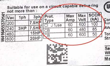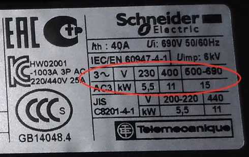В отдельной табличке указываются возможные подключаемые к контактору мощности, в зависимости от питающего напряжения.