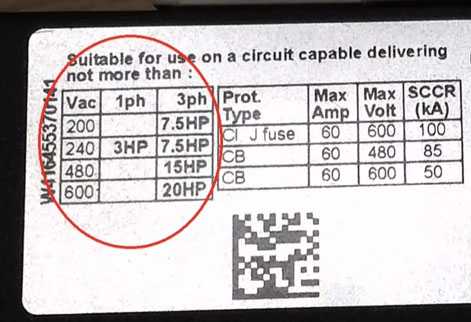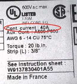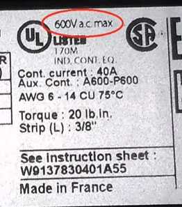 Начнем с контактора от Шнайдер Электрик. На боковой грани указывается максимально возможная подключаемая к контактору мощность в лошадиных силах (HP - horsepower). Зависит данная мощность от питающего напряжения.