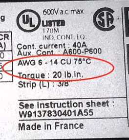 AWG 6-14 Cu – показывает сечение проводов, которые можно подключать к контактам.