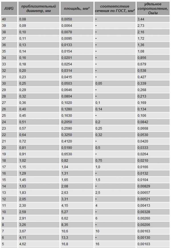 Измерение идет в западных единицах. Для того, чтобы узнать аналог нашего сечения в мм2, потребуется воспользоваться таблицей перевода AWG в мм2.