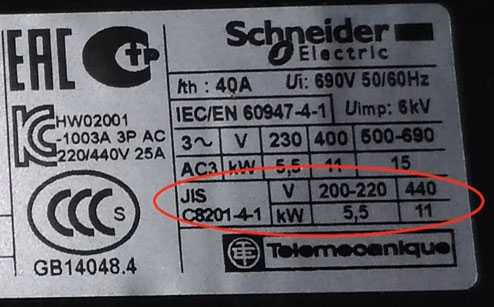JIS C8201-4-1 – это японский промышленный стандарт. Соответственно, здесь также прописывается возможные подключаемые к контактору мощности, в зависимости от питающего напряжения по данному стандарту.