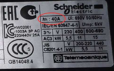 Ith-40А – условный тепловой ток в открытом исполнении. Проще говоря, это тот ток, который может через себя пропустить контактор при нормальных условиях окружающей среды.