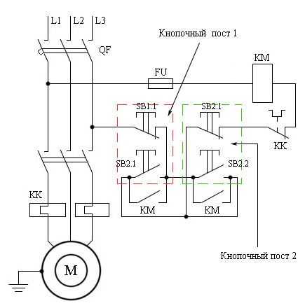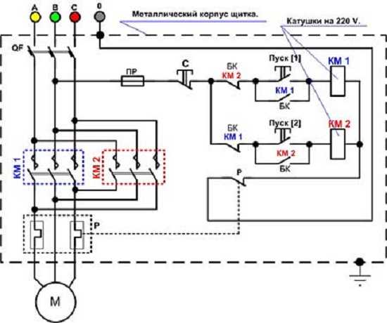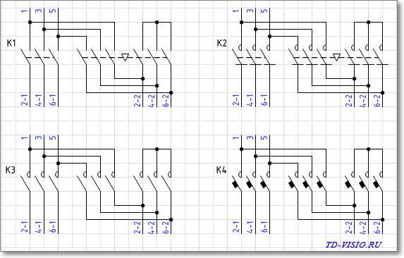 В таких случаях, для удобства, обозначение контактора разбивается на части - отдельно показывается электромагнит (КМ1 и КМ2) и линии питания, проходящие через его силовые контакты (КМ1.1, КМ1.2, КМ2.1., КМ2.2).