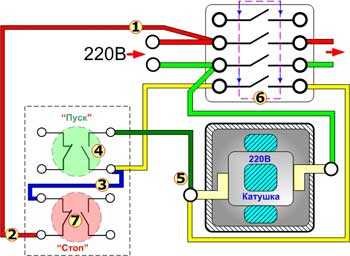 Он имеет в своей конструкции катушку, при подаче напряжения на которую, происходит втягивание сердечника, после чего собственно и замыкаются контакты.