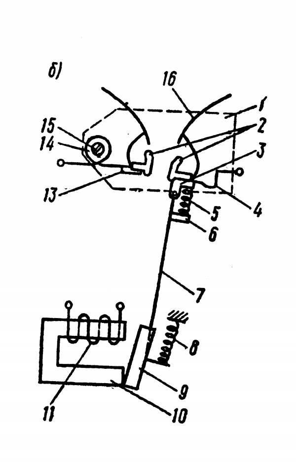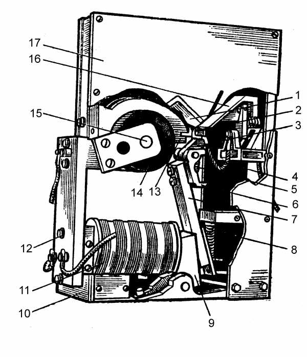 Контактная система: Контактная система расположена на изолированных стойках 12 и 19. На стойке 12 закреплен кронштейн 18 неподвижного контакта. На нем закреплен неподвижный контакт 13, кронштейн имеет выемку под дугогасительную катушку 14 и верхнюю изогнутую часть, которая является дугогасительным рогом. Стойка 19 имеет две стенки. Вверху между ними закреплен кронштейн 20 подвижного контакта 2. Подвижный контакт 2 с держателем 6 и притирающей пружиной 5 расположен на изоляционном рычаге 7, закрепленном на якоре. Подвижный контакт 2 при помощи гибкого, медного шунта 4 соединён с кронштейном 20. Между хвостовиком рычага 7 и перегородкой, закрепленной между стенками стойки, установлена выключающая пружина 8.