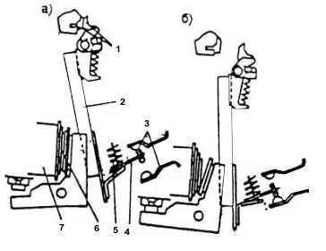 | | Рисунок 32. Блокировочное устройство контактора МК-310 при выключенном положении (а) и при выключенном положении контактора (б). |
