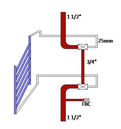 Схема подключения полотенцесушителя предусматривает один из двух возможных вариантов врезки трубы: