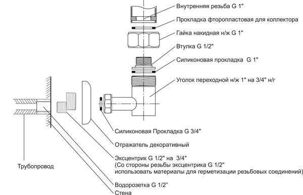 - используя фитинги, изделие присоединяется к вентилям, расположенным на перемычке;