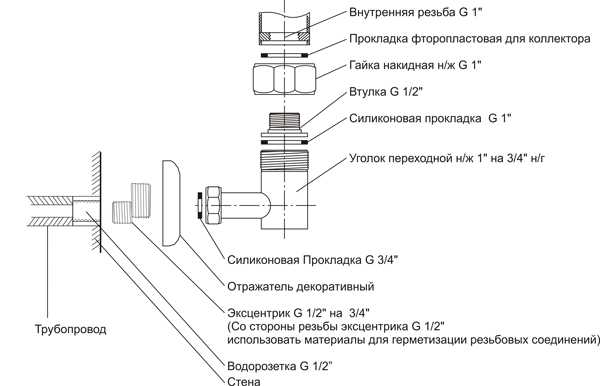 2. Схема подключения полотенцесушителя к ГВС требует приобретения дополнительных соединительных фитингов, для чего берется в расчет способ крепления на полотенцесушителе и водопроводной магистрали: