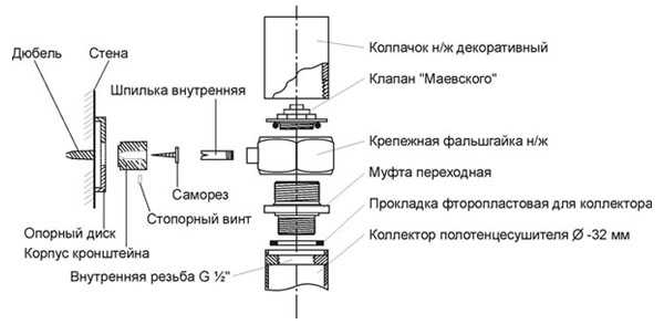 - Воздухоспускной клапан (при монтаже кран Маевского располагается сверху).
