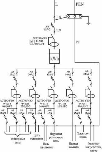 Чертить ее нужно начинать со счетчика (на схеме — kWh), затем идет УЗО и все остальные элементы электросети.
