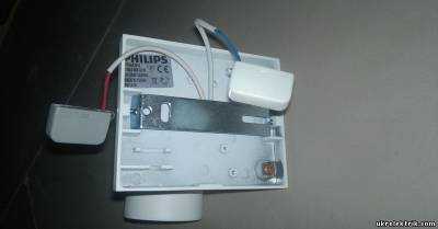 Подключение спота, как и большинства светильников, осуществляется к двум питающим проводникам: фазному, идущему от выключателя, и нулевому, идущему от распределительной коробки. Для подключения концы фазного и нулевого проводников необходимо зачистить на длину 7…10мм, предварительно отключив напряжение с линии в распределительном щитке. Сняв защитные корпуса с клеммных зажимов спота, подключаем фазный проводник (с белой изоляцией) к клемме спота с красным проводом, нулевой (с синей изоляцией) – к клемме с синим проводом. Затем одеваем защитные кожуха на клеммные зажимы спота и фиксируем корпус светильника на монтажной планке двумя винтами.