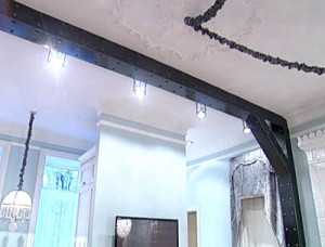 - Подвесные гипсокартонные потолки требуют сначала прокладки кабеля под облицовкой. Затем специальным инструментом в поверхности вырезаются отверстия, и споты устраиваются на место.