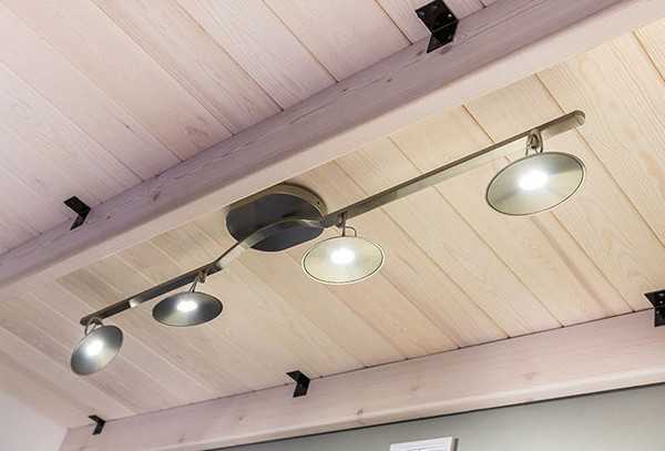 - Споты на кронштейнах легче всего в монтаже – сначала выводится кабель, затем устраивается штанга с установленными осветительными приборами.