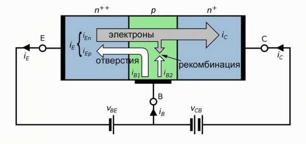 Транзистор данного типа оснащен двумя p-n переходами. Когда в крайней области прибора преобладает электронная проводимость (n), а в средней — дырочная (p), то транзистор называется n-p-n (обратная проводимость). Если наоборот, тогда прибор именуется транзистором типа p-n-p (прямая проводимость).