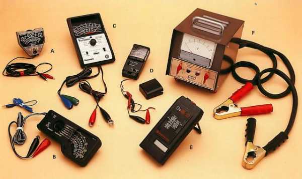 В настоящее время на рынке представлен широкий ассортимент мультиметров - от простых измерителей выдержки прерывателя и тахометров до многофункциональных устройств с десятью различными шкалами или цифровыми табло. На рисунке представлены: A Sparktune: измеритель выдержки, вольтметр, амперметр. B Autoranger: измеритель выдержки, вольтметр, омметр, амперметр, тахометр. B Testune: измеритель выдержки, вольтметр, омметр, амперметр, тахометр. D Hawk: измеритель выдержки, тахометр. E Avometer 2003: вольтметр, амперметр, омметр. F CAB-100: тестер для аккумулятора.