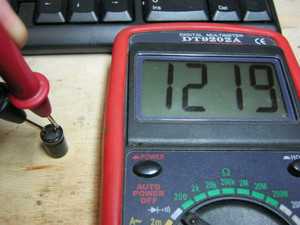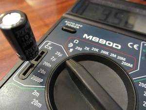 Далее, можно проверять все элементы на исправность. Прекрасным способом станет проверка конденсатора на возможность заряжаться. Для этого необходимо взять деталь электролитического типа и выставить тестер с помощью регулятора в положение прозвонки. Далее, щупы мультиметра нужно установить на деталь согласно обозначениям полярности, плюс к плюсу, минус к минусу. В случае исправности детали, на табло мультиметра будут отображаться плавно возрастающие до бесконечности числовые значения. После того как измеряемый элемент окончательно зарядится, тестер издаст звуковой сигнал, а на табло начнёт отображаться единица, что также свидетельствует о корректной работе проверяемой детали.