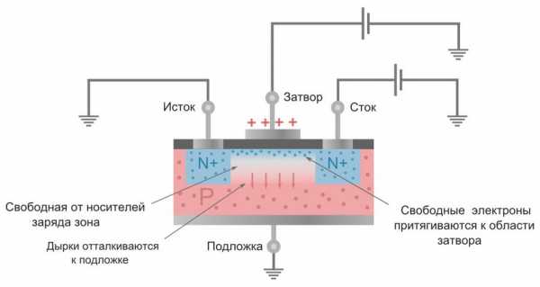 Полевые транзисторы имеют характерные отличия от биполярных. Они оснащены двумя рабочими выводами — истоком и стоком и одним управляющим (затвором). В данном случае на затвор воздействует напряжение, а не ток, что характерно для биполярного типа. Электрический ток проходит между истоком и стоком с определенной интенсивностью, которая зависит от сигнала. Этот сигнал формируется между затвором и истоком или затвором и стоком. Транзистор такого типа может быть с управляющим p-n переходом или с изолированным затвором. В первом случае рабочие выводы подключаются к полупроводниковой пластине, которая может быть p- или n-типа.
