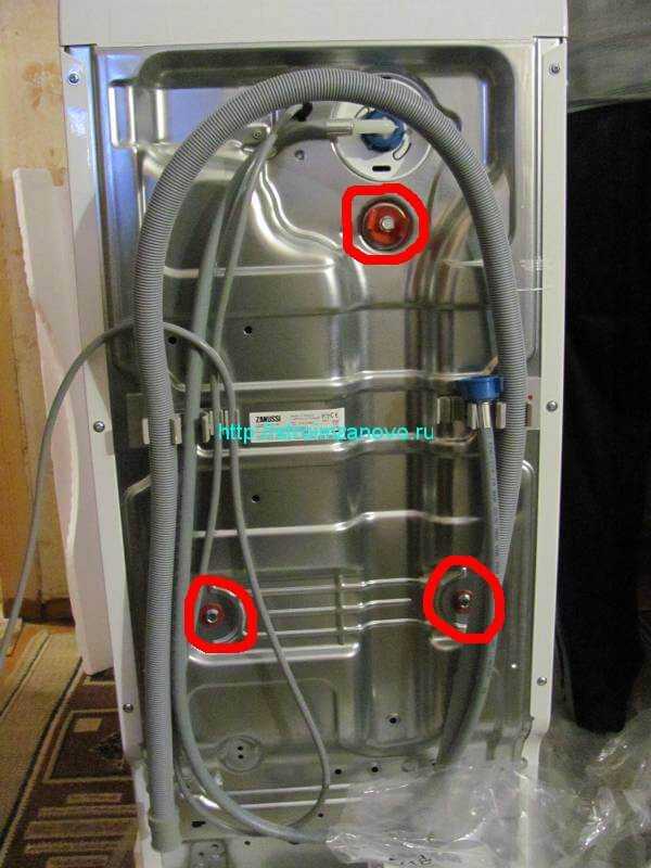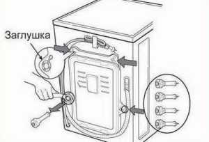 В обязательном порядке выкручиваются стопорные винты, удерживающие барабан в «походном положении». Они расположены сзади, их количество 4 или 5. Винты вынимаются полностью, а в оставшиеся от них отверстия вставляются заглушки. Винты с втулками следует сохранить – они могут понадобиться при возникновении необходимости перевозки стиральной машинки.