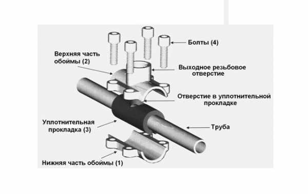 В случае, если проходит длинный целый участок стальной трубы, некоторые используют специальный тройник – хомут бандажного типа. В теле трубы сверлится отверстие, устанавливается и обжимается бандаж, и к образовавшемуся выходу присоединяется через кран шланг машинки.
