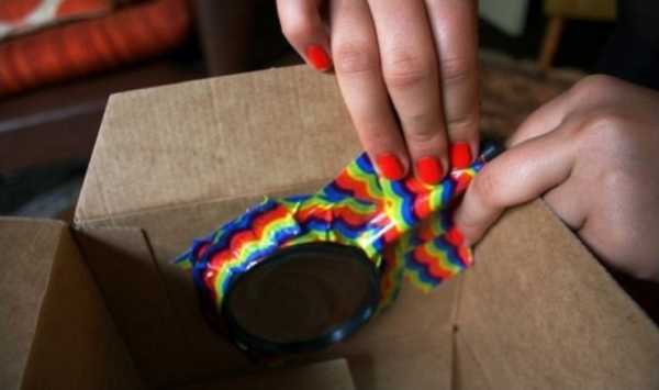 В коробке нужно вырезать отверстие по размеру лупы. Затем вставляем в отверстие лупу и приклеиваем ее скотчем. Также нужно проковырять отверстие для провода смартфона. Из проволоки делаем подставку для смартфона и приклеиваем ее скотчем ко дну коробки.