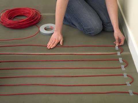 С помощью монтажной металлической ленты, необходимо надёжно закрепить нагревательный электрокабель. Располагают его обычно в форме змейки с шагом примерно в 45-60 сантиметров друг от друга, чтобы максимально эффективно покрыть площадь обогреваемого помещения.