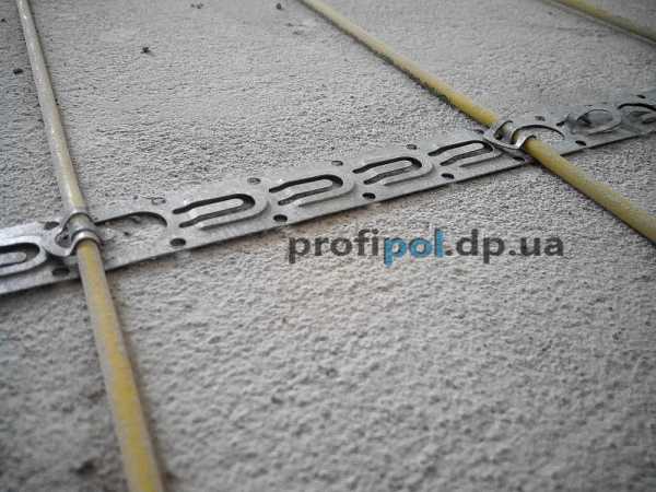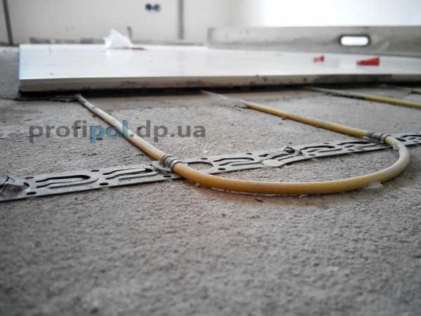 При монтаже, поверх первой стяжки, обычно укладывается штукатурная металлическая сетка для укладки трубы. Затем просто прокладывается коммуникационная труба и закрепляется пластиковыми кронштейнами, для лучшей фиксации.