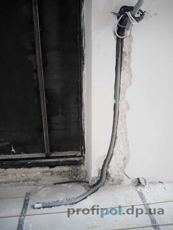 Следующим шагом является подготовка места для монтажа терморегулятора. Используя перфоратор, в стене подготавливают нишу, соответствующую размерам монтажной коробки прибора, и далее вниз по стене и полу штробу для кабелей – силового, датчика и т. д. В канал по поверхности основания параллельно направлению укладки нагревательного элемента закладывают гофрированную трубку – место для датчика. Заглушенный конец гофротрубки должен отстоять от стены примерно на 6 см. Штробу заделывают гипсом.