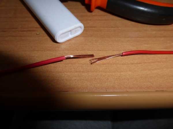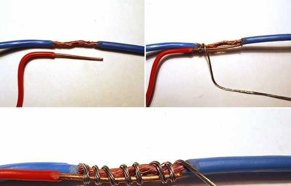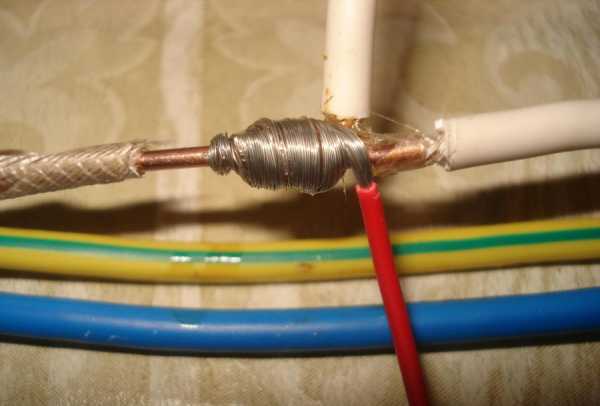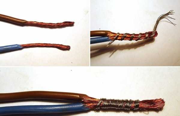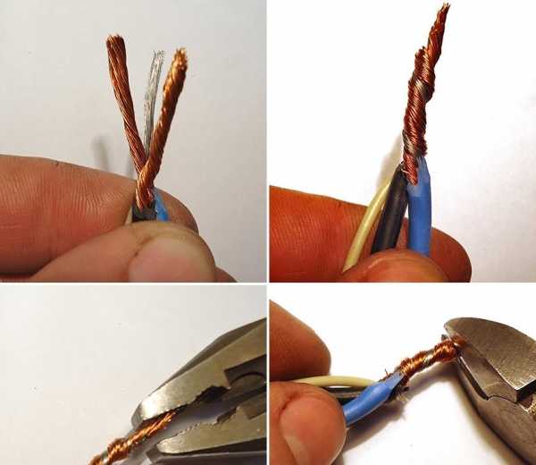 Перед тем, как соединить, провода зачищают и кладут рядом так, чтобы зачищенные концы соприкасались. Приготовленный дополнительный отрезок используйте для бандажа – с его помощью обмотайте провода.