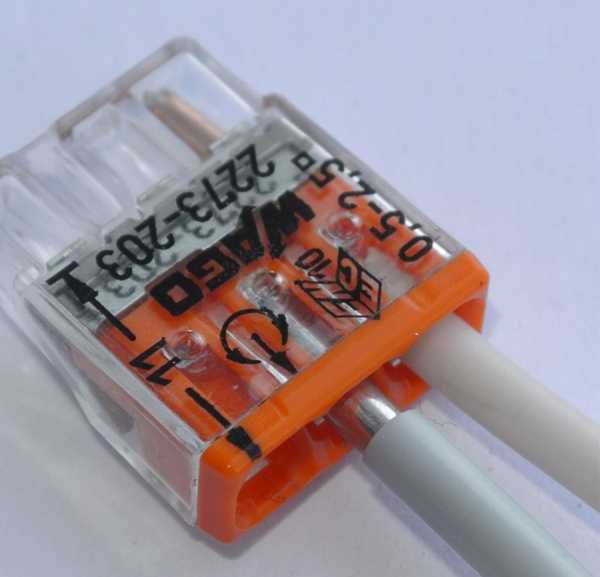 Достаточно снять с провода изоляцию на 10 мм, поднять вверх оранжевый рычажок, вставить провод в клемму и вернуть рычажок в исходное положение. Провод надежно зафиксируется в клеммнике.