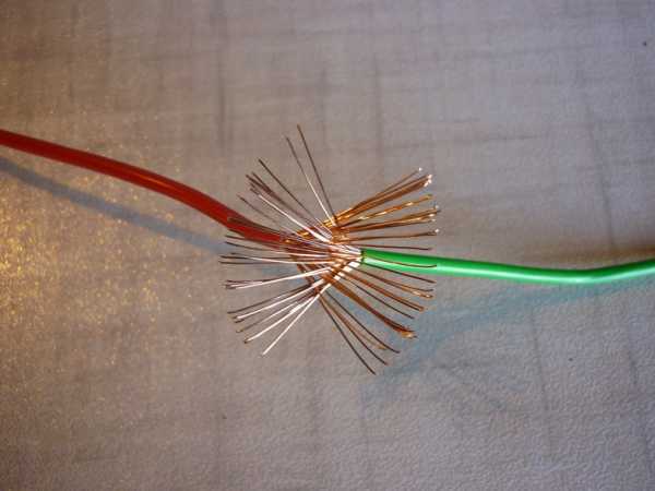 - ⚡многожильные провода распушиваются (жилы разводятся по сторонам) и делятся на две «косички». Можно сделать и несколько косичек, в зависимости от сечения провода.