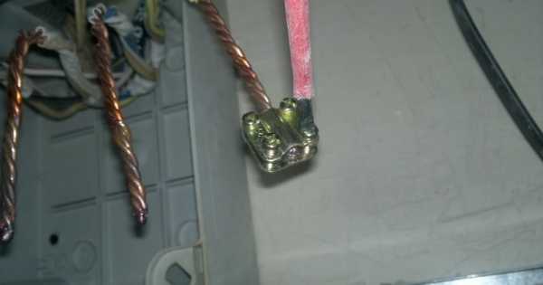 Берется простой болт с гайкой и шайбой. Зачищенным проводам на конце придается форма колечка. И эти кольца одеваются на болт. Причем провод кольца должен изгибаться по направлению резьбы болта.