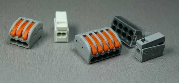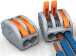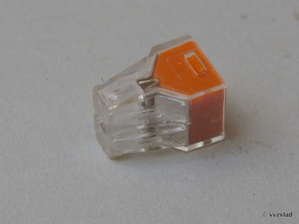 Более удобный клеммник Wago многоразовый, имеющий оранжевый рычажок. Такие клеммники позволяют соединять и в случае необходимости, разъединять между собой любые провода электропроводки, одножильные, многожильные, алюминиевые в любом сочетании сечением от 0,08 до 4,0 мм2. Рассчитаны на ток до 34 А.