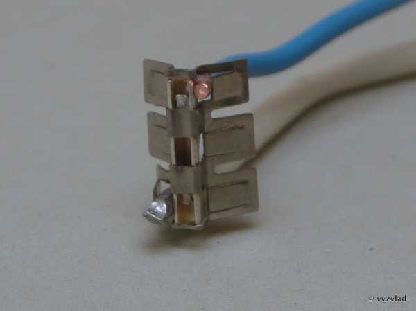 Вернуть меди эластичность, в отличие от черных металлов, можно нагрев ее до красна и быстро охладив. Но для данного случая такой прием не приемлем. Остались концы проводов длиной не более 4 см. Выбора для соединения не оставалось. Только паять.