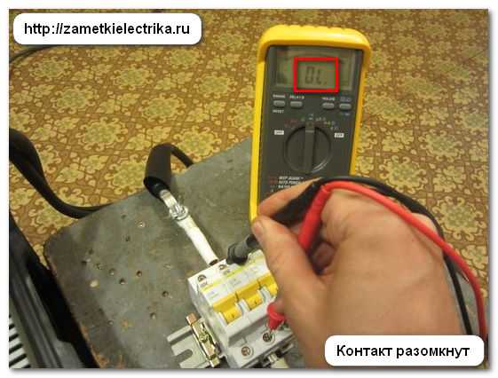Также состояние контакта прогружаемого полюса можно проверить с помощью мультиметра. Как видите, контакт автомата разомкнут.