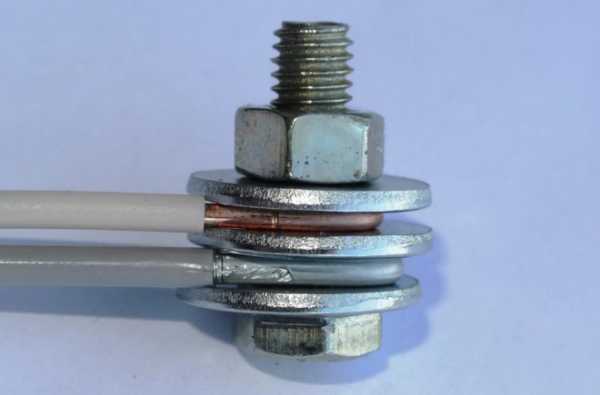 Болтовое соединение алюминиевых проводов с медными считается наиболее доступным, простым, быстрым и надёжным. Для работы вам понадобится болт, гайка, несколько стальных шайб и гаечный ключ.