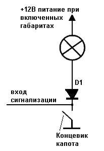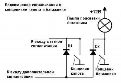 Если автомобиль оборудован штатными концевиками капота и багажника, а также лампой подсветки багажника, то можно использовать выше приведенную схему. Диод D1 исключает влияние концевика капота на лампу багажника, а диод D2 влияние концевика багажника на вход штатного концевика капота. Если концевиков изначально не было, то и диоды развязки не нужны. Если концевик в багажнике есть, то достаточно установить диод D1.