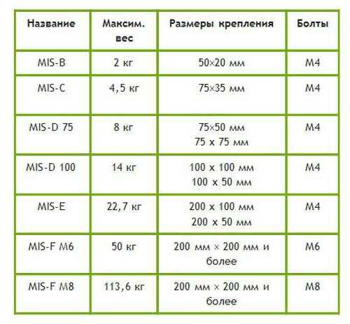Всего существует семь стандартов, которые регламентируют максимально допустимую массу телеприемника, расположение отверстий и тип болтов. Подробную информацию вы можете получить из таблицы ниже.