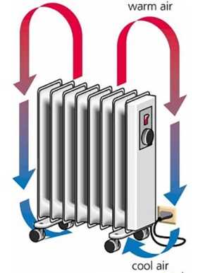 Возникает циркуляция, горячее масло поднимается в верхнюю часть и интенсивно передает тепло металлическим ребрам корпуса, а затем снова опускается к ТЭНу. Разогретые стальные ребра отдают тепло воздуху помещения, также заставляя его медленно циркулировать. Холодный воздух, соприкасаясь с оребрением корпуса, нагревается и поднимается в верхнюю зону комнаты.