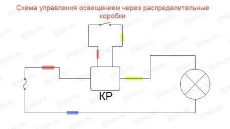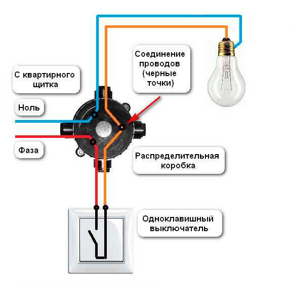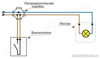 Чаще выключатель удален от светильника и подключения выключателя в схему освещения делается через распределительную коробку.
