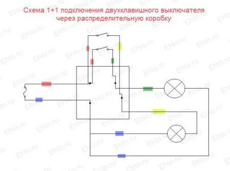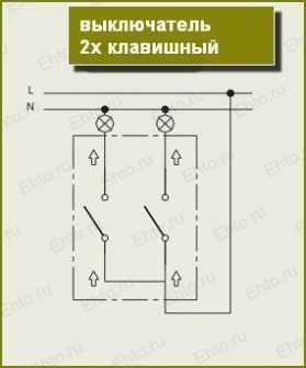Единственное отличие двухклавишного устройства от одноклавишного — наличие пары выходящих контактов. Каждый контакт связан с проводником фазы одной из ламп.