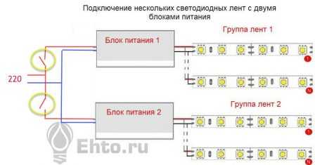 В схемах управления освещением светодиодной подсветки, участвуют блоки питания светодиодных лент. В остальном, принципиальные схемы управления освещением такие же, как для ламп накаливания. Например, такая схема:
