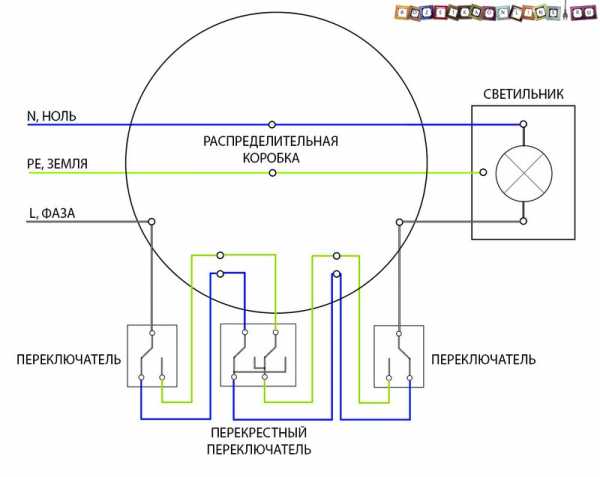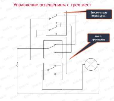 Если же вы решите, что двух выключателей для управления одной лампой вам мало и удобнее если их будет три, пять или больше, тогда вам потребуется изучить схему подключения трех и более выключателей на одну лампу, где к обычным проходным переключателям, добавляются перекрестные.