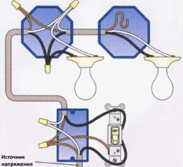 На схеме ниже показано подключение двух лампочек к одноклавишному выключателю.