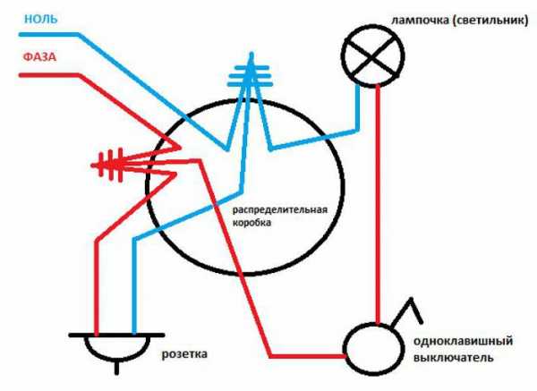 Выключатель подключается в разрыв фазного провода. Нулевой провод идет на лампу напрямую, естественно через распредкоробку.