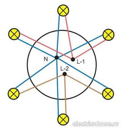 Схема подключения люстры с пятью рожками изображена на рисунке ниже.