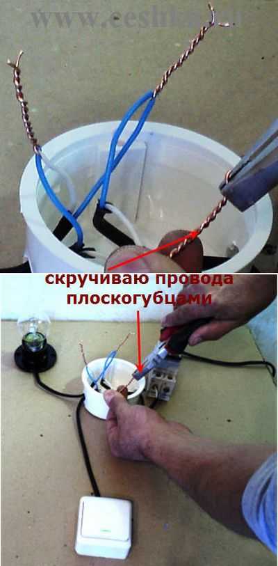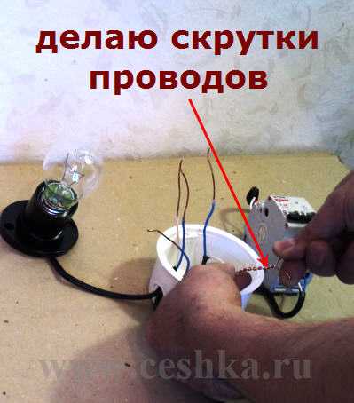 При подключении нужно скрутить между собой провода одного цвета. Полученные скрутки подсоединяют к проводам, идущим через потолок к одноклавишному выключателю, выше описанным способом.