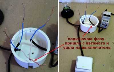 Значит находим фазный провод питания, который приходит в распредкоробку со ввода и соединяем его с одним из проводов, идущего на выключатель.