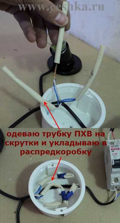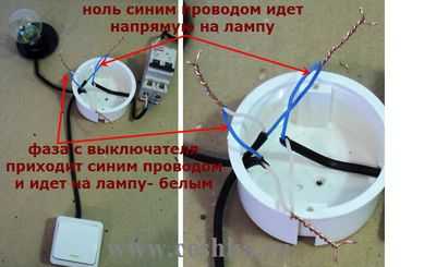 Оставшийся провод с лампы в распредкоробке соединяется с нулевым проводом питания.